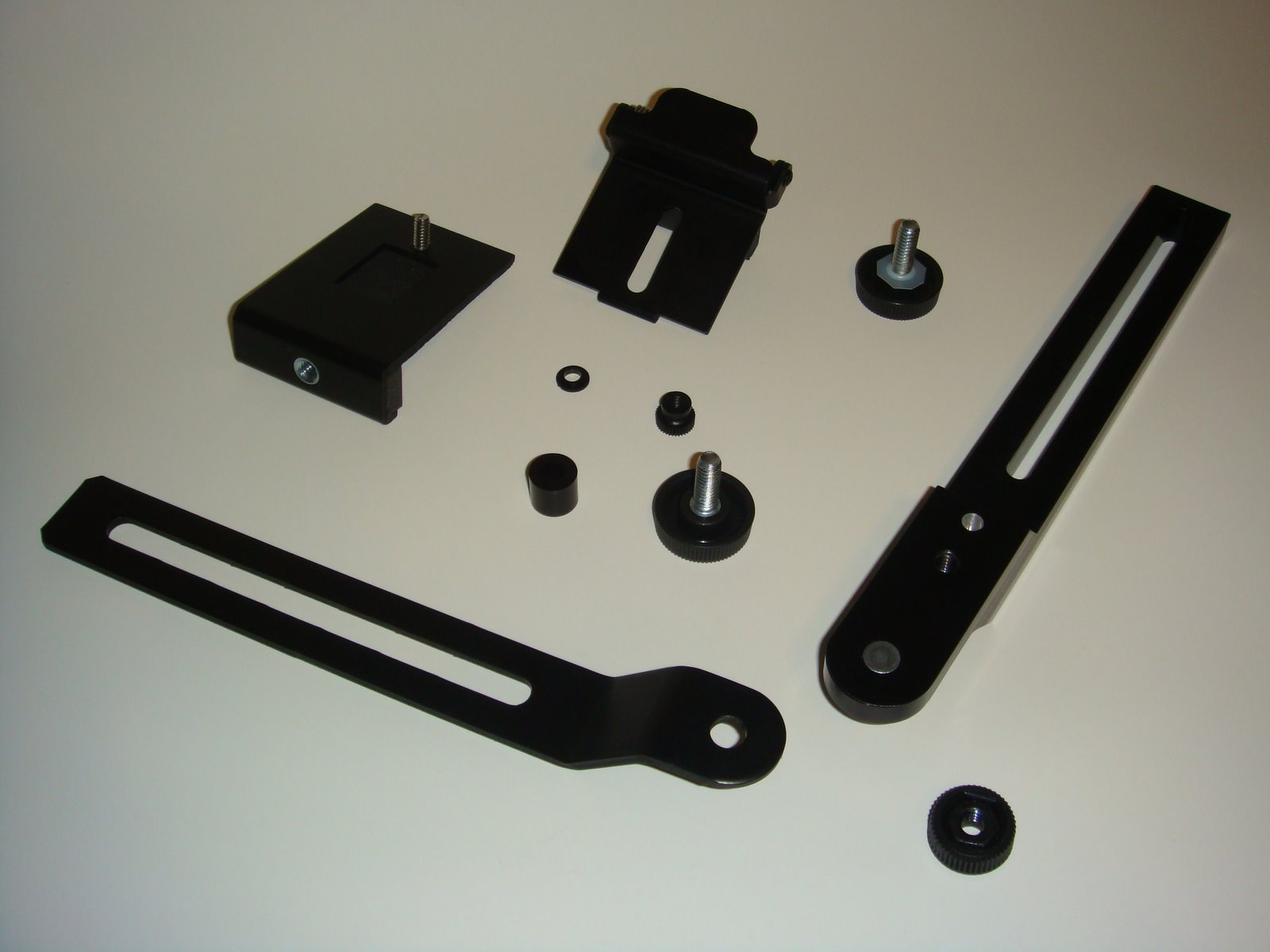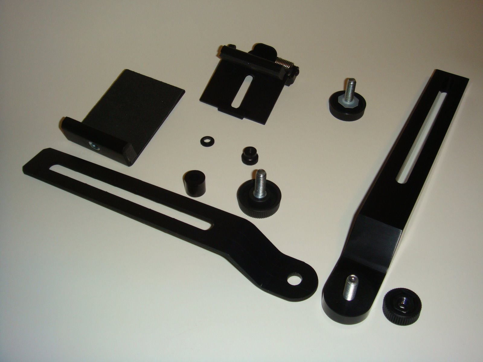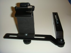 Here is a picture of the assembled ProPrompter Wing. The camera mount part is made from bar stock aluminum and it machined nicely with no rough edges at all, in fact if you strike the middle with your fingernail it will sound like a tuning fork. One of the things I noticed when I screwed the camera mount to the camera is the metal part of the thumbscrew marred the under surface of the camera mount. To fix this I created a small washer out of a plastic milk jug, you can see it on one of the thumbscrews below.