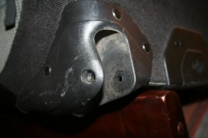 Removing the wheel involves using a set of pliers and a 5mm allen wrench to unbolt the wheel (you also have to unzip the bag liner). The wheel is held in place by a bolt and a lock nut (nut with a plastic part to keep it from accidentally coming loose). I use the pliers to grip the nut since it’s a tight fit.