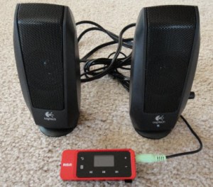 - Purchase a set of computer speakers (about $12) and a low end MP3 player (about $28), both pictured above