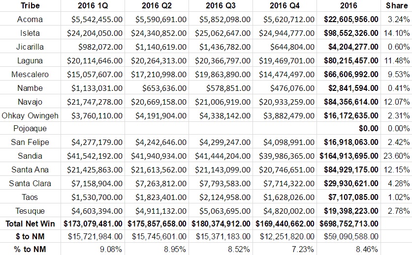 - Total NM Tribal Gaming Net Win for 2016 is $698.7 million