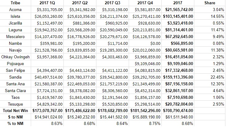 Here is a summary of tribal gaming in New Mexico for 2017 (gaming machines). The reports from the NM Gaming Control Board come out on a quarterly basis (and sometimes amended), and with a little spreadsheet work we can get the yearly picture.