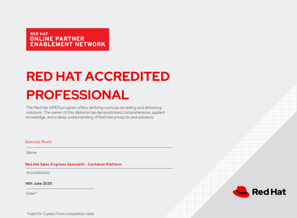• Red Hat Accredited Professional, Red Hat Sales Engineer Specialist – OpenShift Container Platform (OCP)